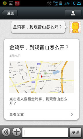 开启此功能,首先要发送地理位置信息,然后输入:驾车厦大医院到厦大西村 或 厦大医院到厦大西村怎么开